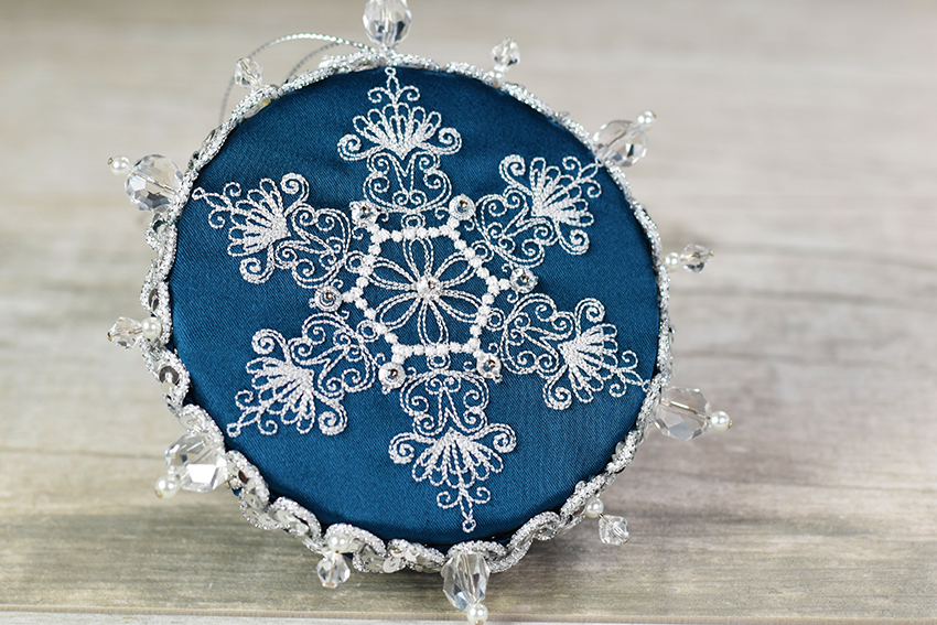 Welcome to my Ornament Girl Inspire Series! These posts will take you only a few seconds to read. Each one will simply contain an ornament picture meant to inspire you & give you some new ideas. Today’s ornament: a stunning Sapphire Snowflake. Pattern Info: This ornament was made with a flat piece of embroidered fabric…